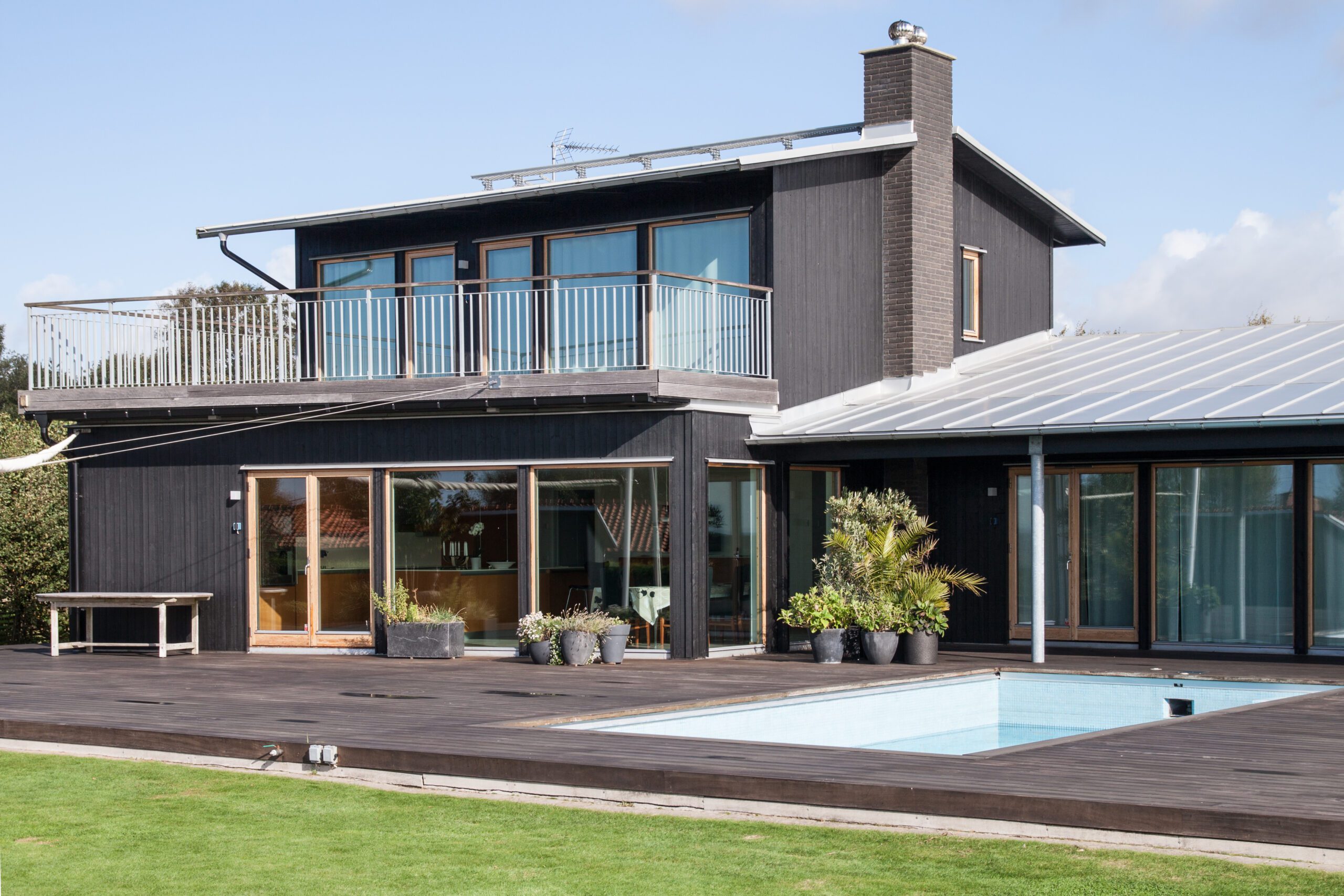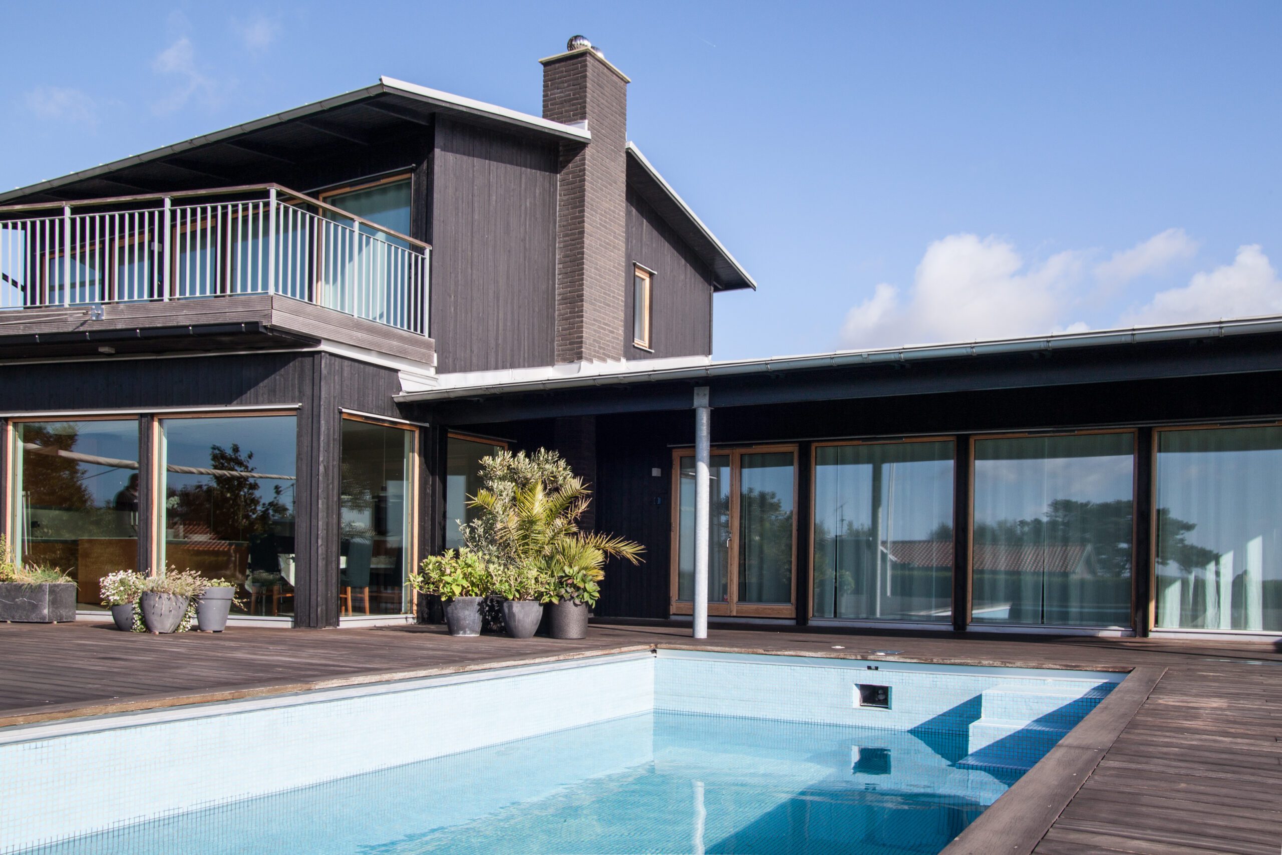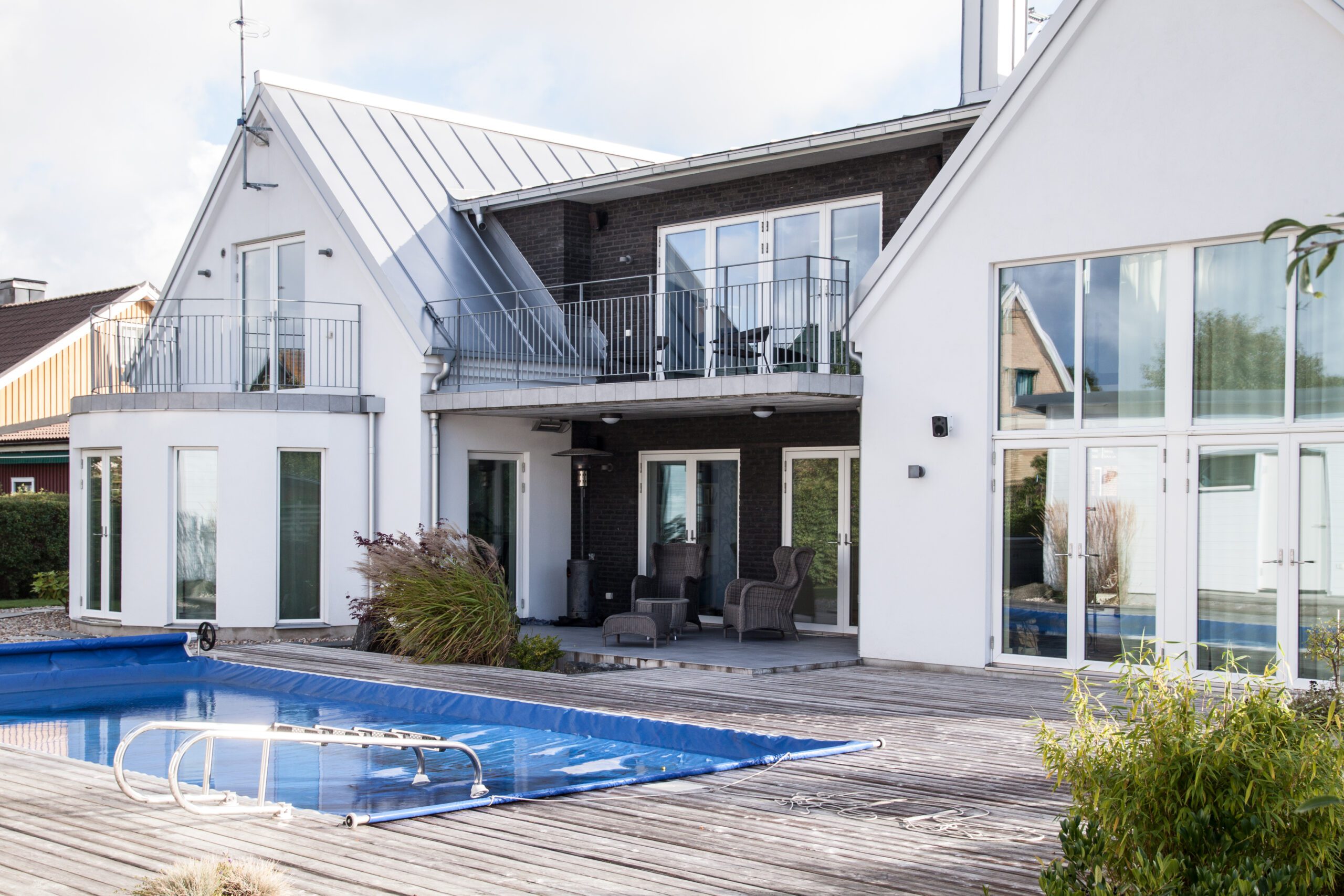 Snygg arkitektvilla byggd i modern stil med stora fönsterpartier, liggande mörk panel och pool integrerat i altandäcket. Som grädden på moset kan man njuta av havsutsikten från både balkong och altandäck.
