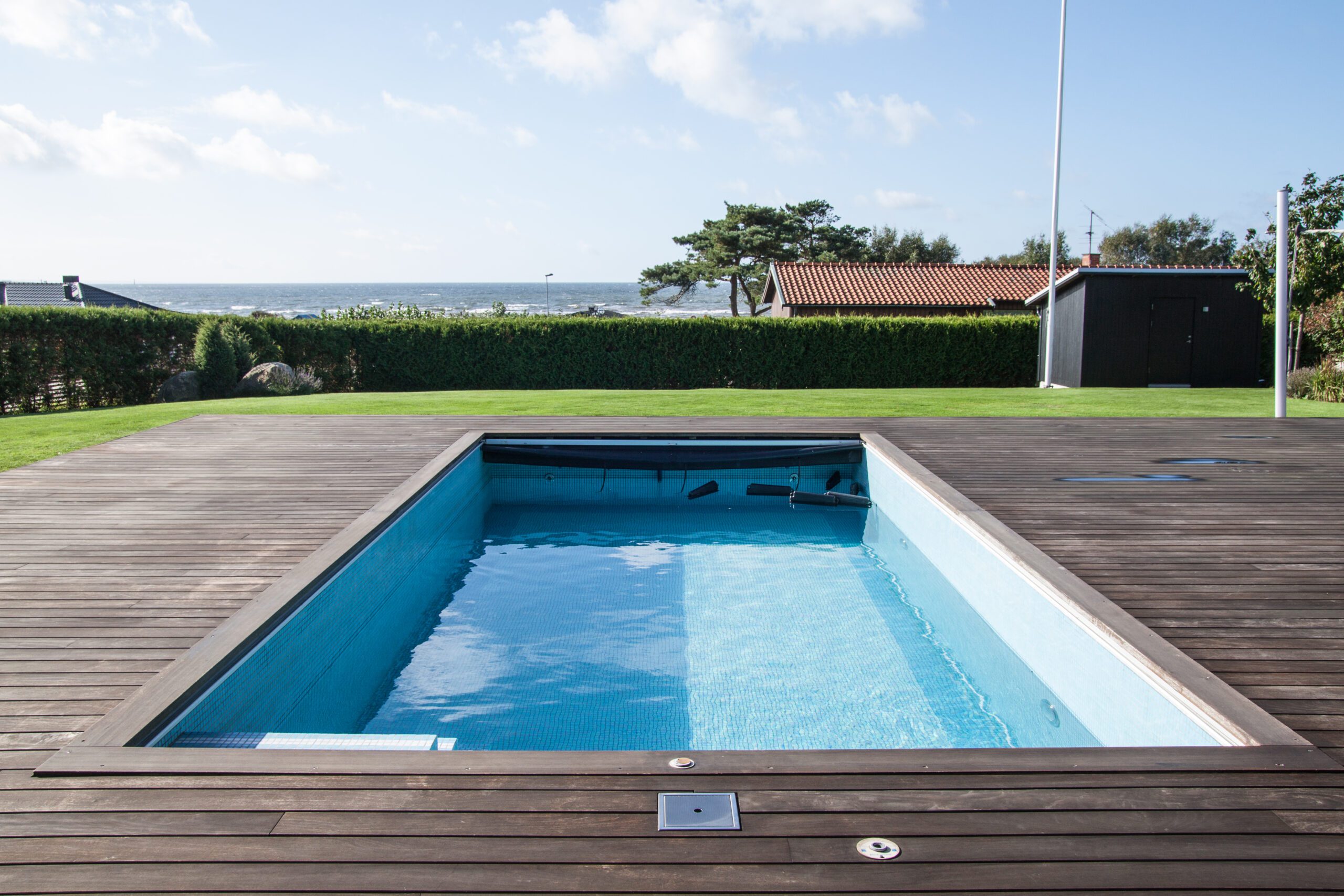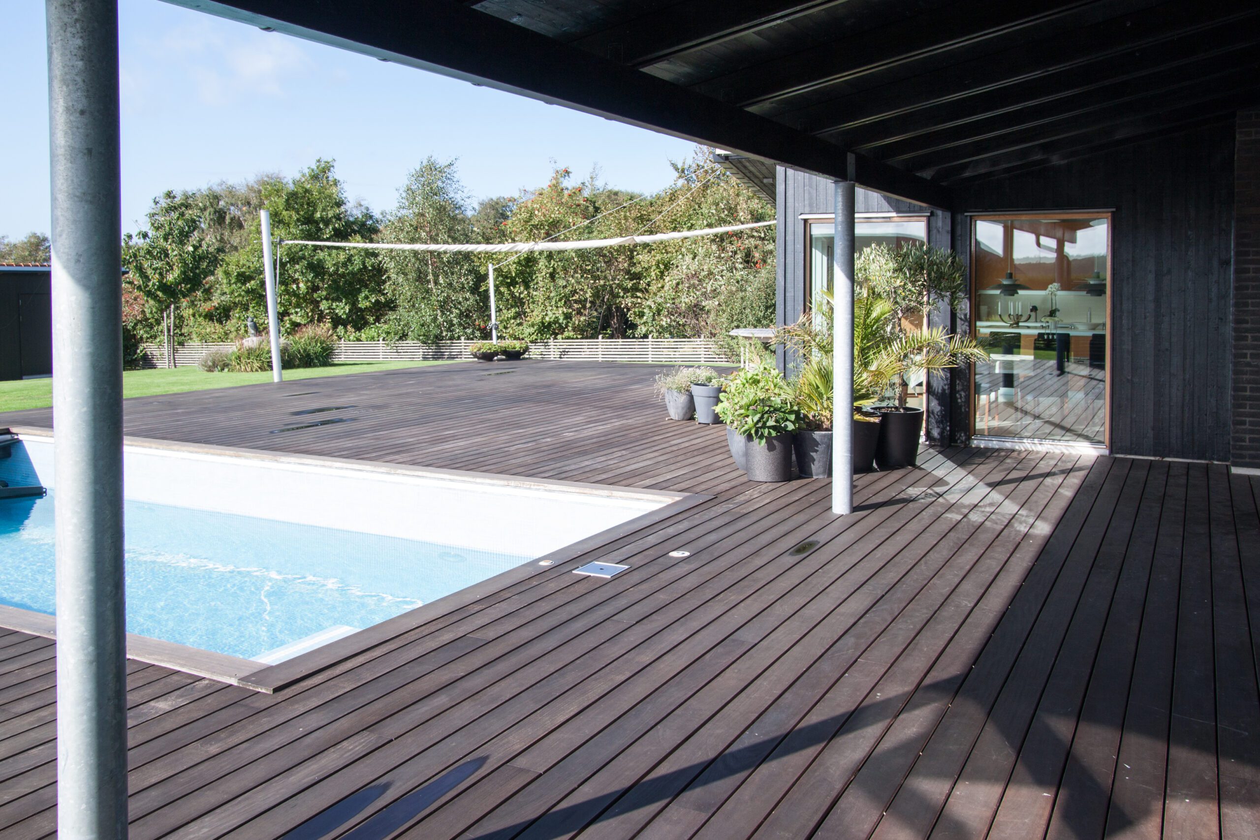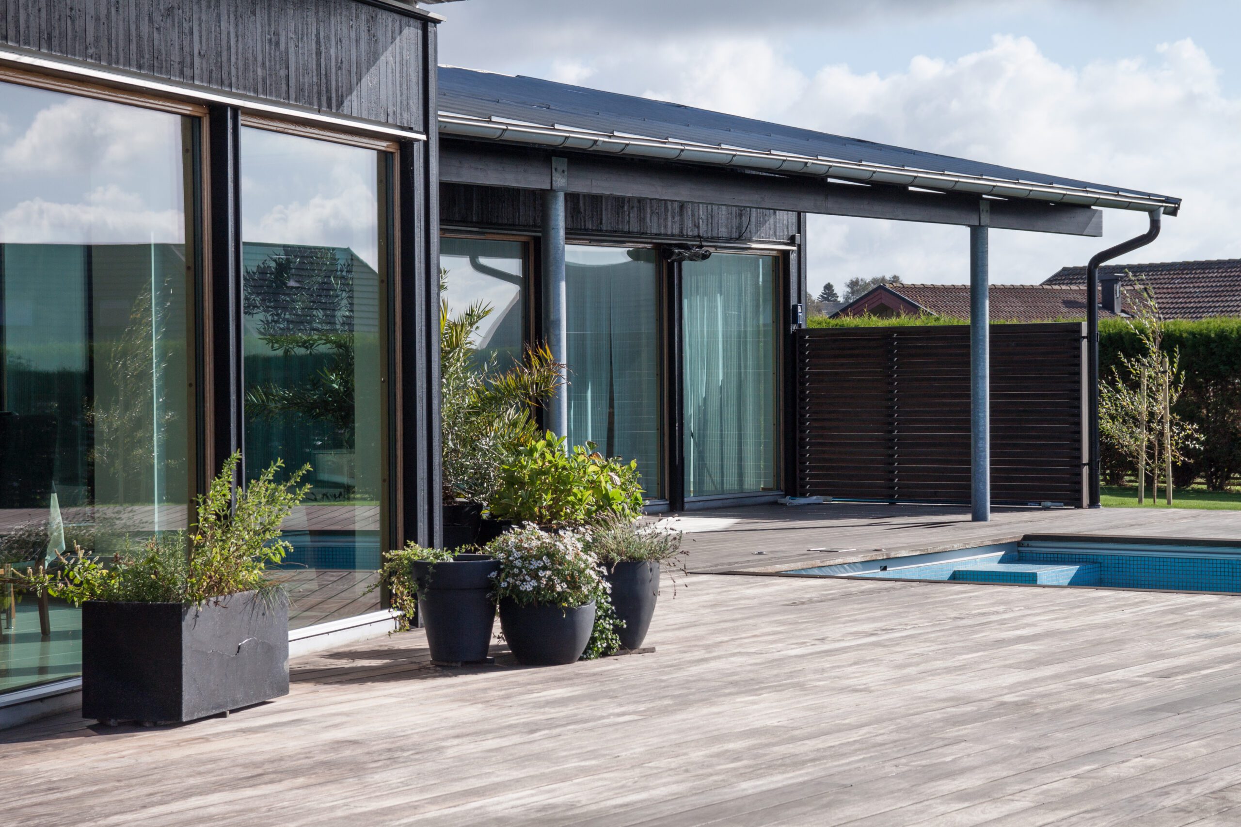 Snygg arkitektvilla byggd i modern stil med stora fönsterpartier, liggande mörk panel och pool integrerat i altandäcket. Som grädden på moset kan man njuta av havsutsikten från både balkong och altandäck.